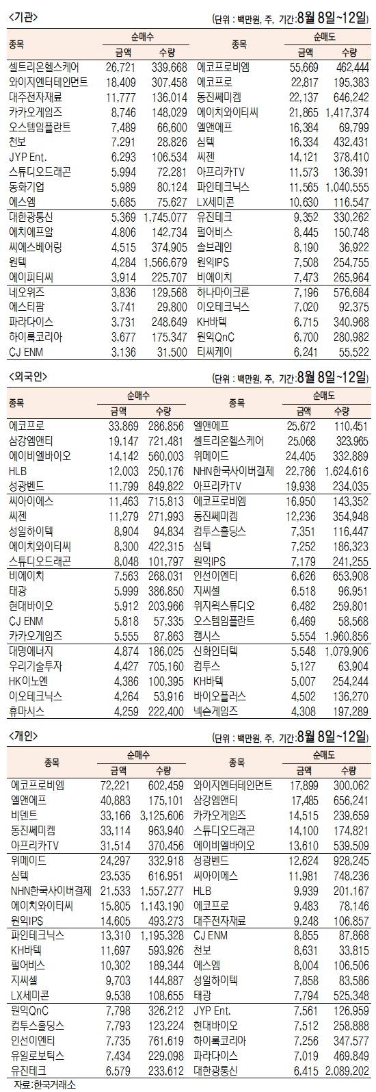 - [데이터로 본 증시]주간 코스피 기관·외국인·개인 순매수·도 상위종목 (8월 8일~12일)