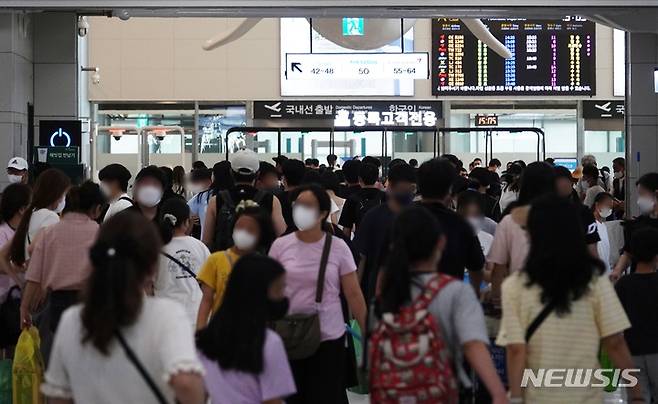 [제주=뉴시스] 오영재 기자 = 15일 오후 제주국제공항 출발장에 출도하는 관광객들의 발길이 이어지고 있다. 2022.08.15. oyj4343@newsis.com