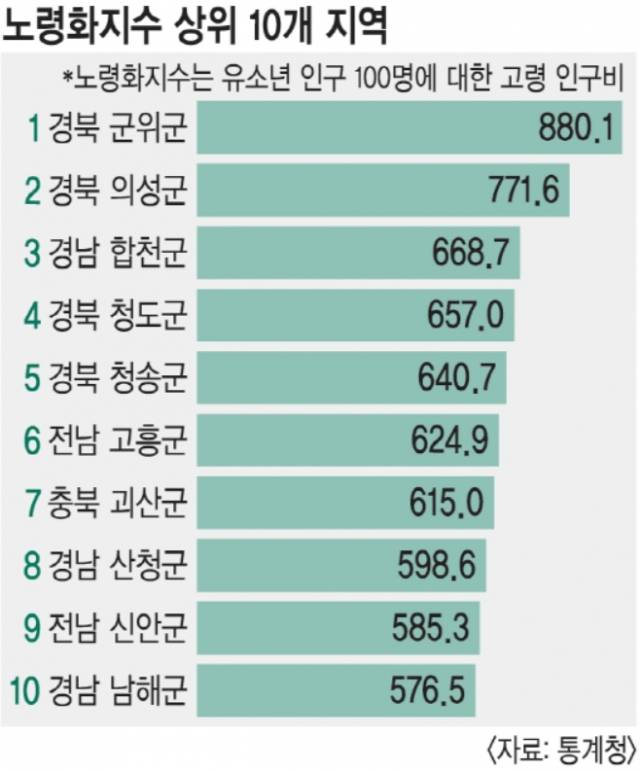 군위 지역은 전국 229개 시·군·구 중에서 수년 째 ‘노령화지수 1위’를 이어가고 있다. 유소년인구(만14세 이하) 100명 당 고령인구(65세 이상)가 880.1명으로 전국에서 가장 늙은 도시다. 가장 빨리 없어질 것으로 예상되는 ‘소멸도시 1위’이기도 하다. 10년 넘게 이어온 마라톤대회가 뛸 사람이 없어 3년 전 걷기대회로 바뀐 것은 이 지역이 처한 현실을 단적으로 말해준다.