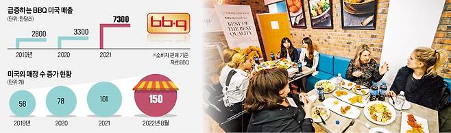 BBQ는 미국에 진출한 국내 프랜차이즈 중 매장 수가 가장 많은 브랜드다. 미국에만 이날 기준 150개다. 2020년 78개에서 지난해 101개로 늘어난 데 이어 매장 수가 빠르게 늘고 있다. 글로벌 외식업 전문지인 네이션스레스토랑뉴스는 최근 미국 내에서 가장 빠르게 성장한 외식 브랜드 25개 중 BBQ를 2위에 선정했다.