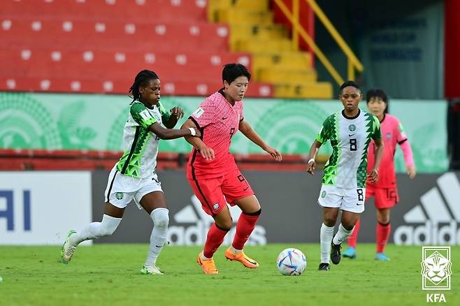 (서울=뉴스1) = 대한민국 U-20 여자 축구대표팀 고유나가 15일(한국시간) 코스타리카 알라후엘라의 알레한드로 모레라 소토 경기장에서 열린 2022 국제축구연맹(FIFA) U-20 여자 월드컵 C조 조별리그 2차전 나이지리아와의 경기에서 드리블하고 있다. 이날 대표팀은 0대1로 패배했다. (대한축구협회 제공) 2022.8.15/뉴스1