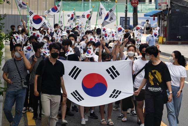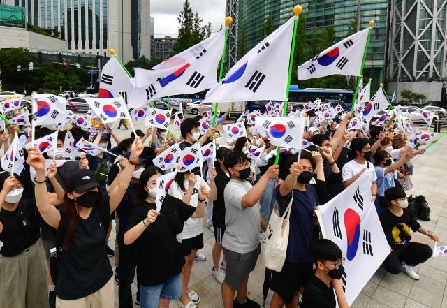 광복절인 15일 서울 종로구청 앞에서 출발한 학생들이 보신각 방면으로 행진하며 대한독립만세를 외치고 있다. 이날 77주년 광복절을 맞아 보신각에서는 타종행사가 열렸다.