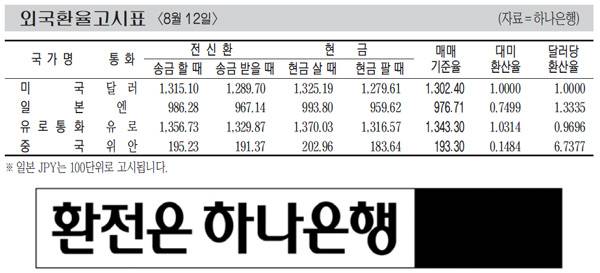 [표] 외국환율고시표 (8월 12일)