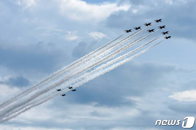 (서울=뉴스1) = 지난 13일 필리핀 바사(Basa) 공군 기지 상공에서 블랙이글스(앞, T-50B/8대)와 필리핀 공군(뒤, FA-50PH/4대)이 우정비행을 펼치고 있다. (공군 제공) 2022.8.15/뉴스1