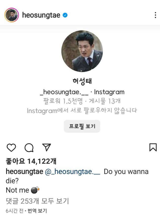 해당 프로필은 허성태의 사진과 함께 영어이름을 기재했다. 허성태는 사진 밑에 “Do you wanna die? Not me(죽고 싶니? 나 아냐)”라는 문구를 적어 해당 계정이 사칭임을 알렸다.