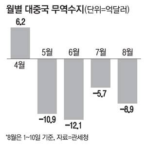 관세청 무역통계에 따르면 이달 1~10일 대중국 무역수지는 8억9000만달러 적자를 기록했다. 이미 지난 5월부터 7월까지 3개월 연속 무역적자를 낸 가운데 4개월 연속 무역적자가 가시화되고 있다. 4개월 연속 무역적자는 1992년 한중 수교를 맺은 이후 사상 첫 기록이 될 전망이다. 대중 무역수지 적자가 이어지는 원인으로는 배터리·부품 등 원자재와 중간재 수지 악화가 꼽힌다. 대표적으로 무역흑자를 거두던 무선통신부품 분야에서는 지난해 1월부터 6월까지 10억8500달러 흑자를 올렸지만 올해 같은 기간에는 1억2800만달러 적자로 전환했다. 마찬가지로 흑자를 내던 액정디스플레이(LCD) 분야에서도 무역수지가 지난해 상반기 17억4400만달러에서 올 상반기 8억3500만달러로 크게 줄었다.