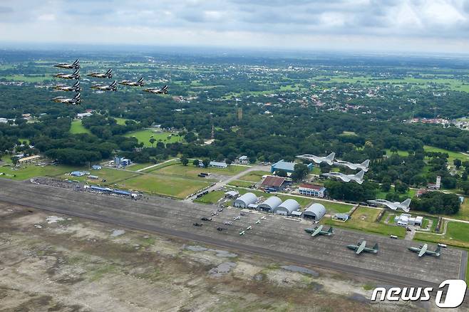 (서울=뉴스1) = 15일 필리핀 바사(Basa) 공군 기지에서 진행된 'ROKAF 블랙이글스 에어쇼'에서 블랙이글스(앞, T-50B/8대)와 필리핀 공군(뒤, FA-50PH/4대)이 편대를 이루어 우정비행을 펼치고 있다. (공군 제공) 2022.8.15/뉴스1