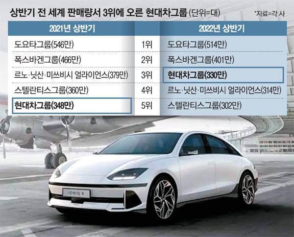 올해 상반기에 완성차 업체 대부분은 지난해부터 이어진 반도체 공급난을 피해 가지 못했다. 판매량 1위인 도요타그룹 판매량이 전년 동기보다 6% 줄어든 것을 비롯해 폭스바겐그룹(14%), 스텔란티스(16%), 르노·닛산·미쓰비시 얼라이언스(17.3%) 등 대다수 완성차 업체의 판매량이 10% 이상 줄었다. 이에 비해 현대차그룹의 올 상반기 판매량은 전년 동기보다 5.1% 감소하는 데 그쳤다. 산업통상자원부에 따르면 지난달 국내 자동차 수출액은 51억4000만달러(6조7128억원)로 역대 최대를 기록했다. 특히 현대차 수출량은 전년 동기보다 9.6% 증가한 9만1649대를 기록했다. 판매량뿐 아니라 수익성도 향상되며 '두 마리 토끼'를 다 잡았다. 현대차의 상반기 영업이익은 4조9087억원, 기아는 3조8405억원으로 나란히 역대 최고치를 기록했다.