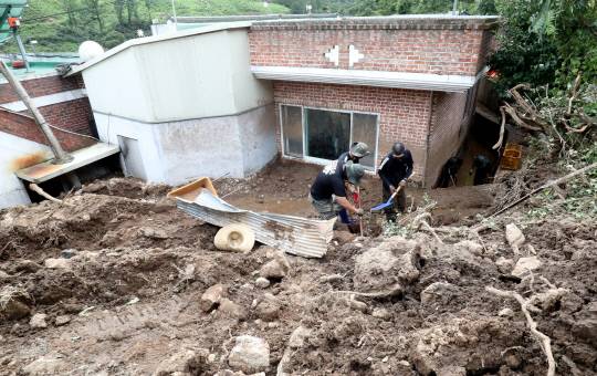 지난 14일 새벽 충남 부여에 시간당 110m가 넘는 폭우가 쏟아지면서 2명이 실종되고 농경지가 침수되는 등 피해가 잇따랐다. 15일 충남 부여군 은산면의 한 주택이 폭우로 인해 아수라장이 되어 있다.