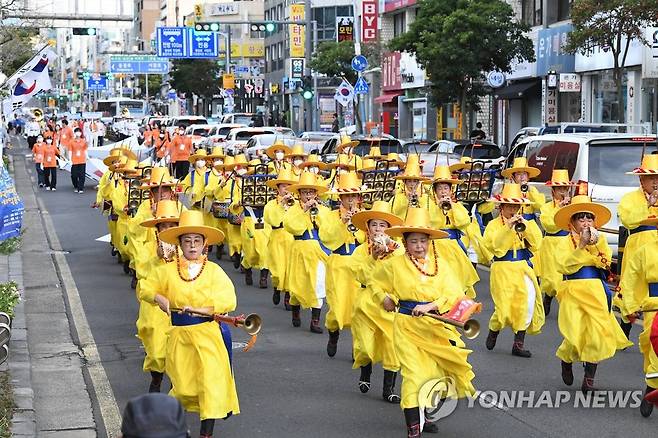 (제주=연합뉴스) 박지호 기자 = 15일 오후 제주시 구도심에서 제주국제관악제 경축 퍼레이드가 진행되고 있다. 2022.8.15
