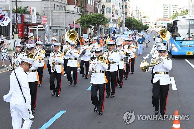 (제주=연합뉴스) 박지호 기자 = 15일 오후 제주시 구도심에서 제주국제관악제 경축 퍼레이드가 진행되고 있다. 2022.8.15
