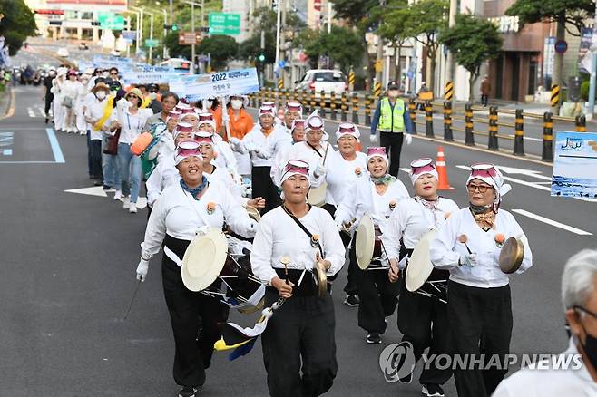 (제주=연합뉴스) 박지호 기자 = 15일 오후 제주시 구도심에서 제주국제관악제 경축 퍼레이드가 진행되고 있다. 2022.8.15