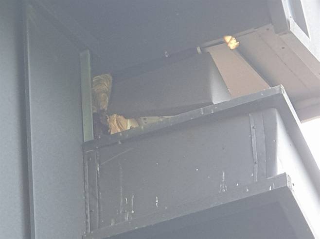 하지만 교대로 두 번째 사다리에 올라가 작업한 소방관은 "말벌집은 처마 밑 틈새 안쪽 깊숙이 있는 거 같다"며 "지금 상태로는 원천적인 제거는 불가능하다"고 했습니다. "처마 밑 틈새 속 말벌집과 거실이 연결돼 있는 거 같아 물로 쏠 수도 없고, 그렇다고 처마를 뜯어낼 수도 없기 때문"이라는 겁니다. 어쩔 수 없이 당장 눈에 보이는 말벌들만 살충제로 잡고 말벌집에도 약을 듬뿍 뿌리는 정도로 작업을 끝냈습니다.