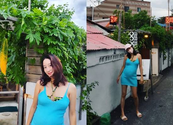 사진 속에는 파란 원피스를 입고 주문진의 골목을 돌아다니는 전혜빈의 모습이 담겨 있다. 눈에 띄는 만삭 D라인이 시선을 사로잡는다.