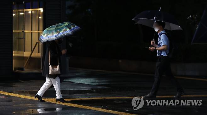 (서울=연합뉴스) 김인철 기자 = 15일 오후 서울 서초구 고속버스터미널 앞에서 우산 쓴 시민들이 발걸음을 옮기고 있다. 2022.8.15