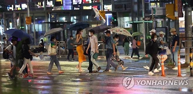 (서울=연합뉴스) 김인철 기자 = 15일 오후 서울 서초구 고속버스터미널 앞에서 우산 쓴 시민들이 발걸음을 옮기고 있다. 2022.8.15