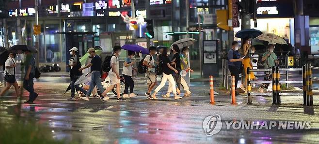 (서울=연합뉴스) 김인철 기자 = 15일 오후 서울 서초구 고속버스터미널 앞에서 우산 쓴 시민들이 발걸음을 옮기고 있다. 2022.8.15