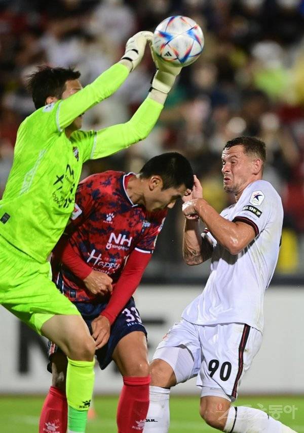 15일 경북 김천종합운동장에서 열린 ‘하나원큐 K리그1 2022’ 김천 상무와 FC서울의 경기에서 FC서울 일류첸코가 헤딩 과정에서 상대 골키퍼의 펀칭에 놀라고 있다.