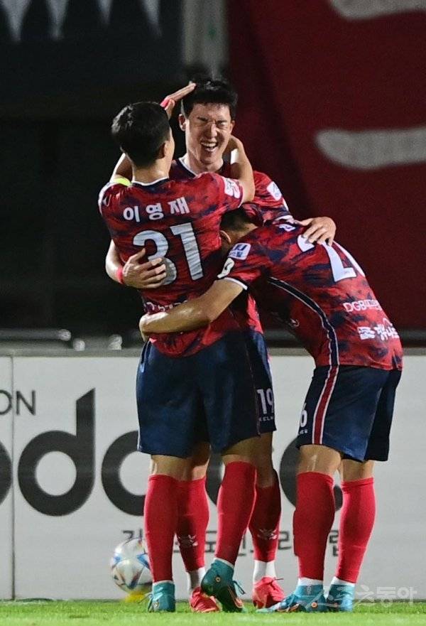 15일 경북 김천종합운동장에서 열린 ‘하나원큐 K리그1 2022’ 김천 상무와 FC서울의 경기에서 김천 김경민이 선제골을 성공시킨 후 동료들의 축하를 받고 있다.