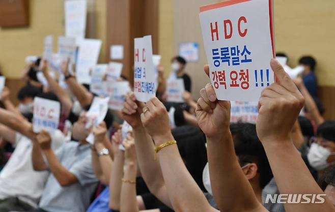 [광주=뉴시스] 변재훈 기자 = 붕괴 사고가 난 화정아이파크 입주예정자들이 15일 오후 광주 서구 김대중컨벤션센터에서 열린 이재명 더불어민주당 당대표 후보의 토크 콘서트에 참석해 단체 HDC규탄 손팻말을 들고 있다. 2022.08.15. wisdom21@newsis.com