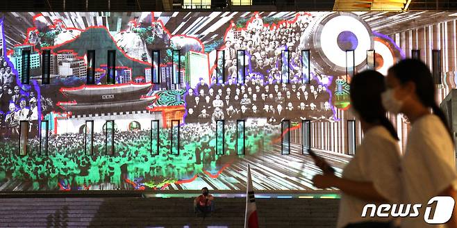 (서울=뉴스1) 이동해 기자 = 광복절 77주년인 15일 밤 서울 종로구 세종문화회관 외벽에 광복의 기쁨을 빛으로 표현한 미디어파사드 '함성'이 전시되고 있다. 2022.8.15/뉴스1