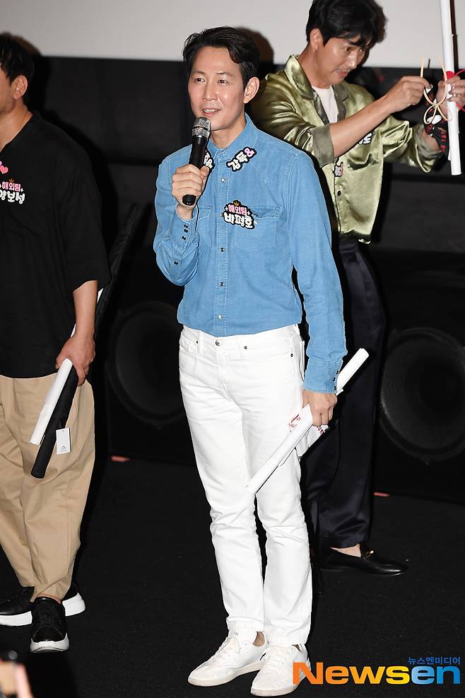 이정재 감독을 비롯해 배우 정우성과 정만식이 8월 15일 오후 서울 양천구 목동 행복한세상백화점 6층에 위치한 메가박스 목동에서 진행된 영화 ‘헌트’ 무대인사에 참석해 관객과의 시간을 갖고 있다.