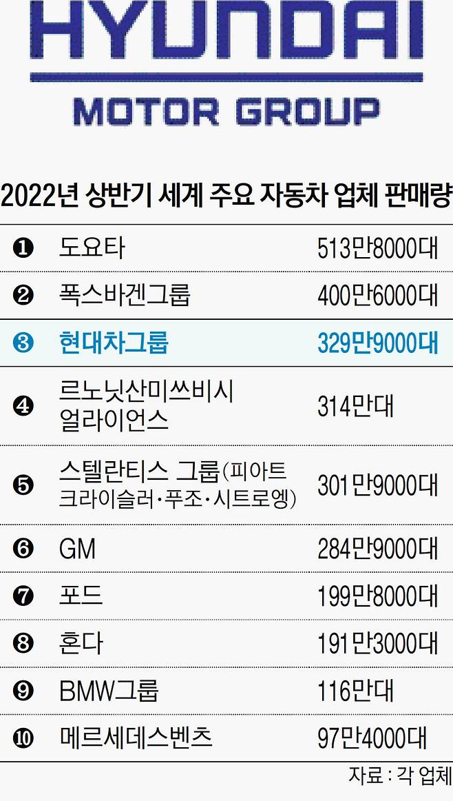 15일 전 세계 완성차 업체의 실적 발표(IR) 자료에 따르면 현대차그룹은 올 상반기에 329만9000대를 판매해 전 세계 판매량 3위를 기록했다. 2010년 포드를 제치고 5위에 올라선 지 12년 만이다.