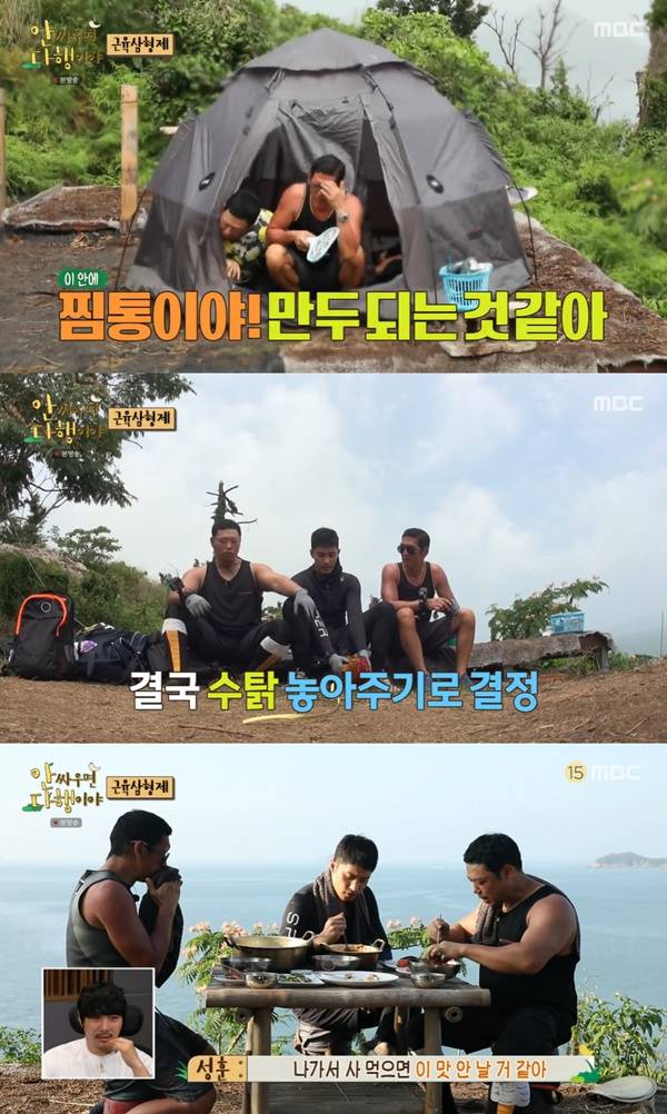 박준형은 "얘 못 먹겠다"며 양치승에 "솔직히 너 잡을 수 있어?"라고 물었다. 결국 마음이 약해진 세 사람은 상의 끝에 닭은 풀어주며 달걀을 먹기로 결정했다.