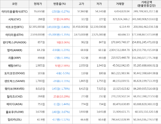 또한, 플로우(-3.67%, 3,670원), 웨이브(-1.78%, 8,010원), 에이다(-1.44%, 753원), 리플(-1.39%, 498원), 이더리움(-1.35%, 2,559,000원), 앵커(-1.23%, 64.2원), 질리카(-1.12%, 61.9원), 샌드박스(-1.11%, 1,780원), 이더리움클래식(-0.27%, 55,650원)이 하락세를 나타냈다.