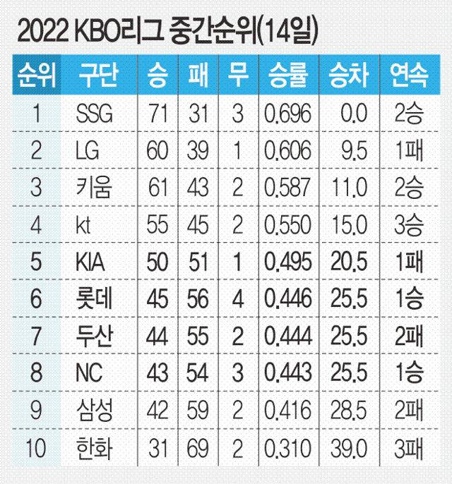 15일 현재 KIA 타이거즈가 2022 KBO리그 5위에 자리한 가운데, 롯데 자이언츠·두산 베어스·NC 다이노스가 5게임 차 뒤진 6위권을 형성하고 있다.