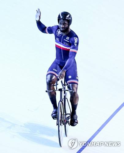 epa10122567 Melvin Landerneau of France celebrates winning the Men's cycling individual time trial 1km final of the Track Cycling events at the European Championships Munich 2022 in Munich, Germany, 15 August 2022. EPA/FILIP SINGER