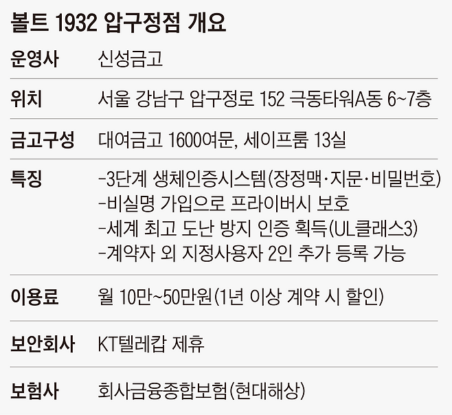 은행 대여금고와 민간 대여금고는 각각 장·단점이 있다. 공신력만 놓고 보면 은행 대여금고가 민간보다 낫다. 은행이 운영하기 때문이다. 그러나 은행 대여금고는 계좌 정보와 연동돼 있어 프라이버시 보호에 취약하다. 은행이 대여금고를 누가 이용하는지 다 알고 있다. 볼트1932는 다르다. 사용자 외에 금고 존재 여부를 누구도 알 수 없다. 사용계약을 할 때 실명을 요구하지 않기 때문이다. 장정맥(손바닥정맥)과 지문, 비밀번호를 활용한 3단계 생체인증시스템으로 사용자를 확인한다. 볼트1932 압구정점에서 만난 이용객 A씨는 “은행 대여금고는 이용할 때마다 친한 은행 지점장이나 직원이 얼굴을 알아보기 때문에 불편하다”며 “볼트1932는 아내와 자식조차 그 존재를 몰라서 속편하다”고 했다.