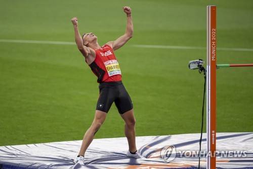 epa10123175 Switzerland's Simon Ehammer cheers during the High Jump competition of the Men's Decathlon of at the European Championships Munich 2022, Munich, Germany, 15 August 2022. EPA/GEORGIOS KEFALAS