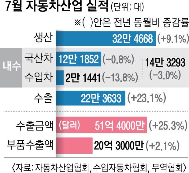 15일 산업통상자원부가 발표한 '7월 자동차산업 동향(잠정)'에 따르면 지난달 자동차 수출량 및 수출액은 1년 전과 비교해 각각 23.1%, 25.3% 증가한 22만 3633대, 51억 4000만 달러(약 6조 7100억원)를 기록했다.