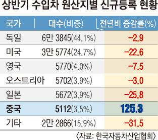 승용차도 잘 팔렸다. 중국 지리차 산하의 전기차 전용 브랜드 폴스타를 비롯해 글로벌 브랜드의 중국 생산 모델인 IX3(BMW), S90(볼보)의 수입도 늘어나면서 전년 같은 기간보다 83.9% 늘어난 3400대를 기록했다.