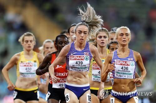 epa10123302 Eilish McColgan and Samantha Harrison (R) of Great Britain compete in the women's 10.000m final during the Athletics events at the European Championships Munich 2022, Munich, Germany, 15 August 2022. The championships will feature nine Olympic sports, Athletics, Beach Volleyball, Canoe Sprint, Cycling, Artistic Gymnastics, Rowing, Sport Climbing, Table Tennis and Triathlon. EPA/RONALD WITTEK