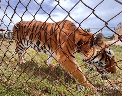 epa10123349 A tiger walks inside the animal sanctuary Santuaai in the city of Ezequiel Montes, Mexico, 15 August 2022. Three tigers rescued from Black Jaguar-White Tiger (BJWT) shelter of Mexico City were relocated to Santuaai. EPA/Sergio Adrian Angeles
