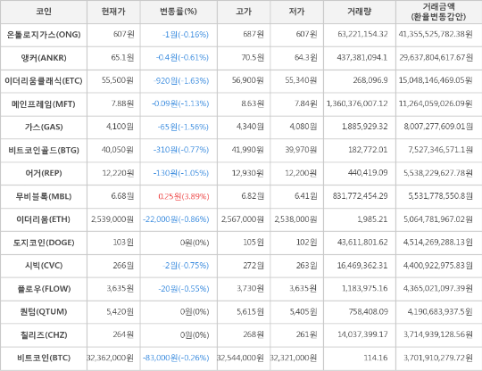 또한, 가스(-1.56%, 4,100원), 메인프레임(-1.13%, 7.88원), 어거(-1.05%, 12,220원), 이더리움(-0.86%, 2,539,000원), 비트코인골드(-0.77%, 40,050원), 시빅(-0.75%, 266원), 앵커(-0.61%, 65.1원), 플로우(-0.55%, 3,635원), 온톨로지가스(-0.16%, 607원)가 하락세를 나타냈다.
