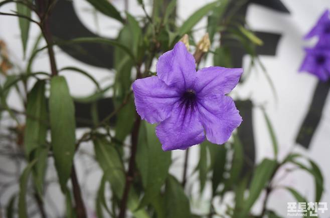 주택가 조그만 암자 앞에 있는 화분에 보라색 루엘리아 브리토니아 꽃이 예쁘게 피어있습니다.