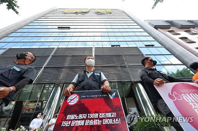 (서울=연합뉴스) 김도훈 기자 = 전국민주노동조합총연맹(민주노총) 공공운수노조 화물연대가 서울 강남구 하이트진로 본사 점거 농성에 돌입한 16일 오전 노조원들이 본사 앞에서 피케팅을 하고 있다. 2022.8.16