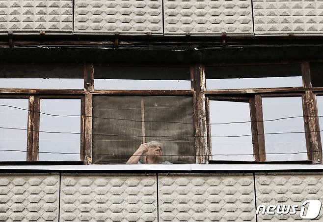 (크라마토르스크 로이터=뉴스1) 손승환 기자 = 13일(현지시간) 우크라이나 도네츠크주 크라마토르스크에서 한 여성이 자택 창문을 통해 밖을 내다보고 있다. 크르마토르스크는 우크라이나군의 지역 본부가 위치한 전략적 요충지다.