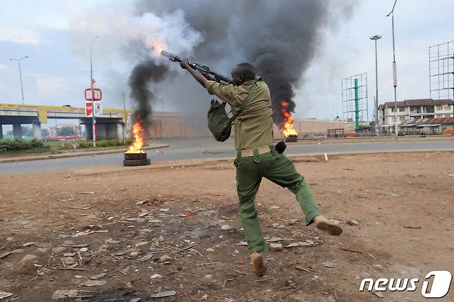 시위대 향해 최루탄 쏘는 케냐 경찰관