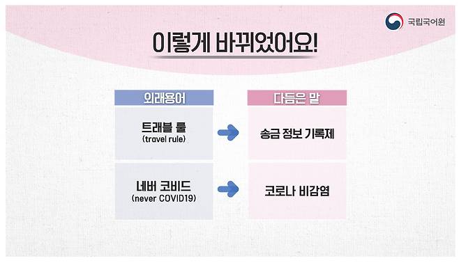 온라인에서 가상 자산이나 자금을 주고받을 때 자금 세탁 등을 방지하기 위해 주고받는 사람의 정보를 기록하도록 하는 원칙을 뜻하는 '트래블 룰(travel rule)'의 우리말 대체어로는 '송금 정보 기록제'가 선정됐다.
