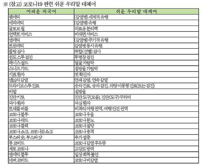 이밖에 코로나 19관련 대체어로는 '감염병 세계적 유행(팬데믹)', '승차(드라이브 스루) 진료', '추가접종(부스터샷)', '침방울(비말) 등이 있다.