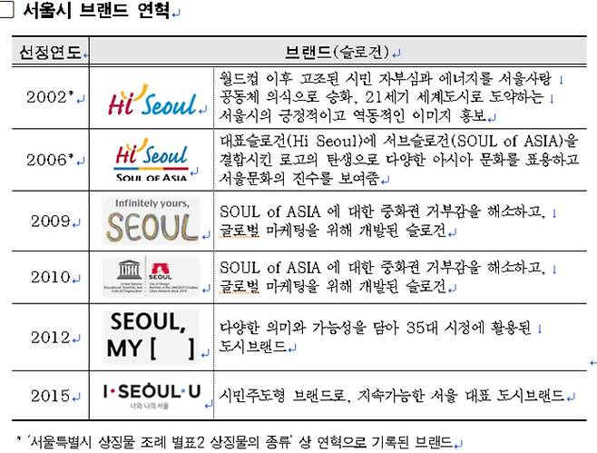 서울시는 “서울의 역동성과 매력, 글로벌 선도도시로서의 지향점을 담아 ‘서울’ 하면 떠오르고 세계인이 사랑하는 브랜드를 만들겠다”고 16일 밝혔다. 현재 사용 중인 ‘아이·서울·유’가 모호한 의미인 데다 영문 표기로 의미를 전달하는 직관성이 부족하다는 판단에서다. 서울시민 1000명과 서울을 방문한 외국인 200명을 대상으로 실시한 조사에서도 인지도 등에서 부정적 평가를 받았으며, 새 브랜드가 필요하다는 의견이 많았다고 서울시는 설명했다.