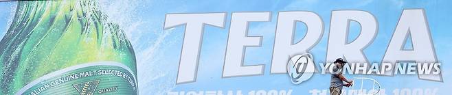 (서울=연합뉴스) 김도훈 기자 = 16일 서울 강남구 하이트진로 본사 옥상 점거 농성을 벌이고 있는 전국민주노동조합총연맹(민주노총) 공공운수노조 화물연대 소속 조합원이 대형 옥외광고판 앞을 지나고 있다. 2022.8.16