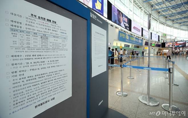 2022년 추석 승차권 예매가 시작된 16일 서울역 매표소 앞 알림판에 예매 안내문이 설치돼 있다.