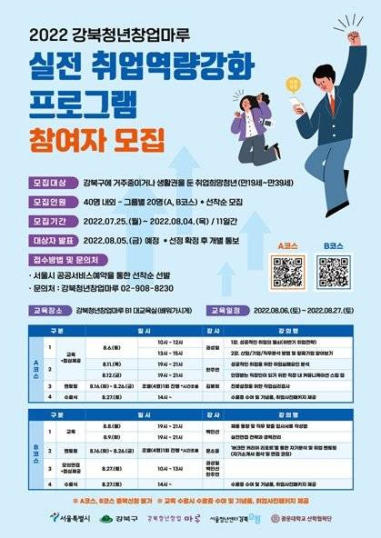 광운대학교 산학협력단(단장 박철환)이 위탁 운영하는 강북청년창업마루(센터장 권혜진)가 8월 6일부터 27일까지 강북구에 거주하거나 생활권을 두고 있는 취업희망청년(만19세~39세)을 대상으로