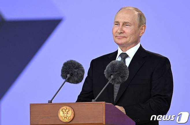 (쿠빈카 AFP=뉴스1) 우동명 기자 = 블라디미르 푸틴 러시아 대통령이 15일(현지시간) 모스크바 인근 쿠빈카에서 열린 방위 산업 전시회인 육군 2022 포럼 개막식 축사서 "러시아는 가장 현대적인 무기를 동맹국에 제공할 준비가 돼 있으며, 이들 대부분은 실전에 활용된 적이 있다"고 밝히고 있다.