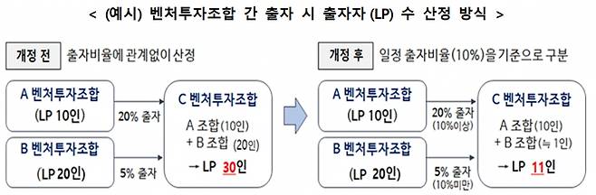 출자비율이 벤처투자조합 결성금액의 10% 미만인 경우 출자하는 조합원 수와 관계없이 출자자 1명으로 산정된다. 지금까지는 벤처투자조합 출자자 수가 49명 이하로 제한되기 때문에 조합원 수가 많은 벤처투자조합은 다른 벤처투자조합에 출자하는데 제약이 있었다. 이를 테면 10명이 출자한 A조합과 20명이 출자한 B조합이 각각 20%, 5%를 출자해 C조합을 결성할 경우 출자자수는 30명으로 산정됐다. 개정 후에는 10%이상을 출자한 A조합은 10명 그대로, 10%미만을 출자한 B조합은 1명으로 산정돼 11명이 출자한 것으로 산정된다.
